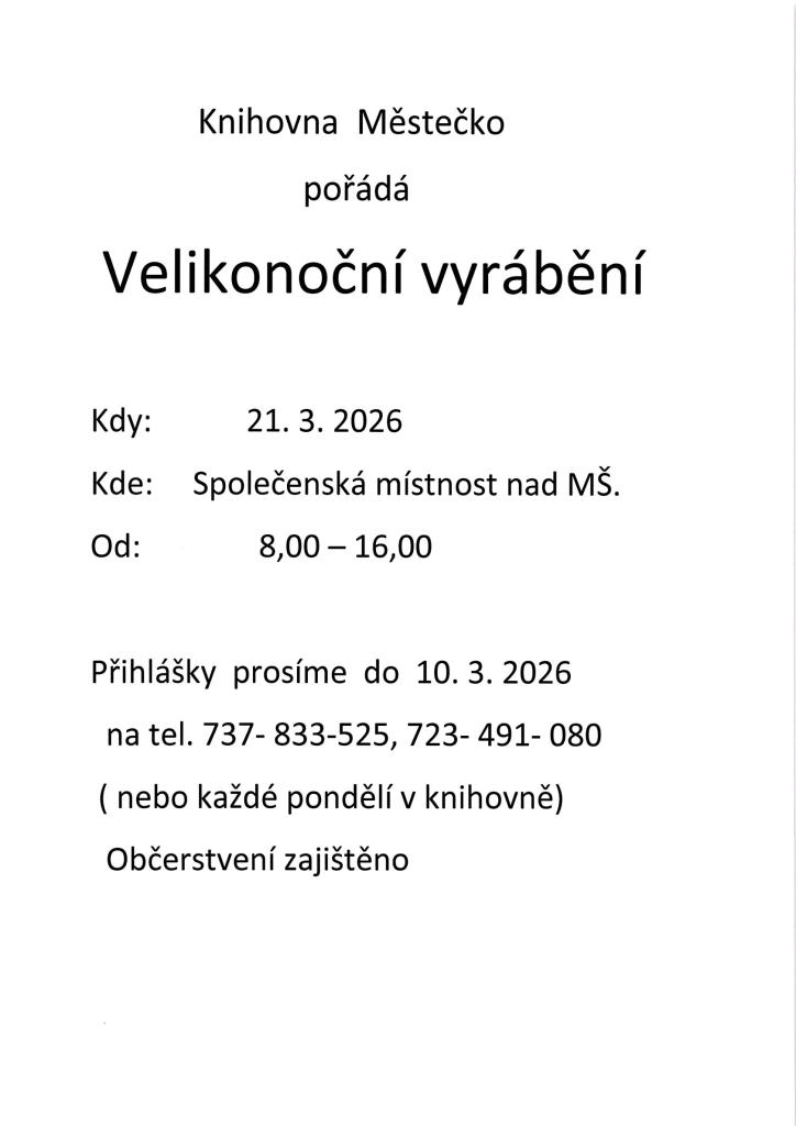 Přihlášky prosím do 10.3. na tel. 737 833 825 nebo 723 491 080, případně každé pondělí v knihovně.